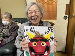 節分に向けて、色紙飾りを制作しました。 形を確認しながら、皆さん集中して取り組まれていました。