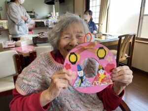 制作活動で、おひなさまのリースを作りました。 折り紙や色紙を使い、はさみで切ったり貼り合わせたりしながら、一つひとつ丁寧に仕上げていきます。 お内裏様とお雛様を飾り、周りに花を添えて、春らしい華やかなリースが完成しました […]